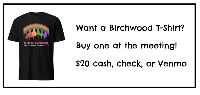 Your Birchwood Neighborhood Association usually has five community meetings per year, which are generally held the fourth Tuesday of the September, October, January, March, and May from 6:30-8:00 pm. We send out email reminders to alert you, so make sure you sign up below!